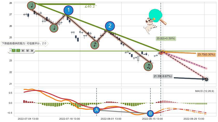 ♘ 在最后的下跌阶段2022-06-30 13:00至2022-08-12 14:00,存在 持续未破位的阻力位 ,阻力价格23.82,可信任强度65.78%,其距离最后价格23.68相差 +0.59%