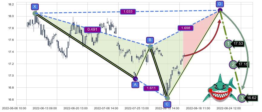 ➢ 距离预测D点位置尚有上涨空间,短线依然【看涨】, 耐心等待看跌【鲨鱼】形态反转启动
