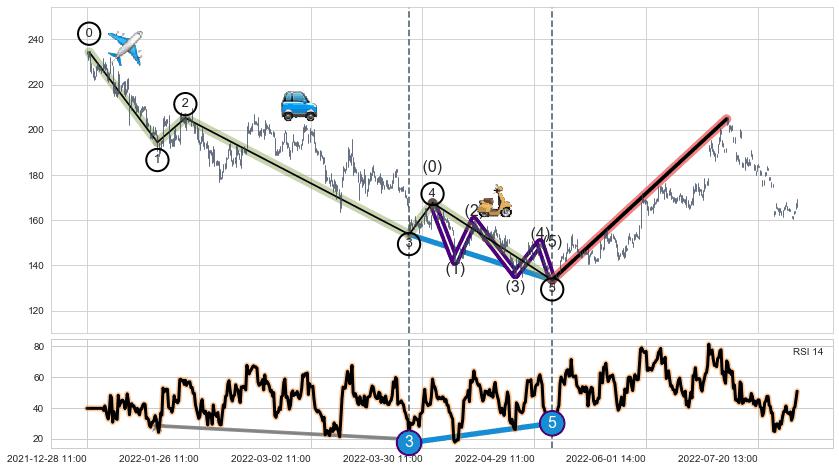 ➣ 第一, 三, 五浪下跌动能逐渐【衰弱变小】,趋势呈现不稳迹象