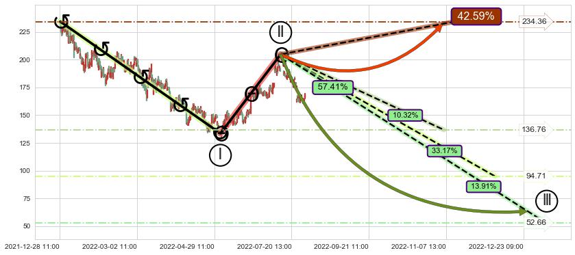 ➣ 调整浪已超过预测的c点位置,后续大趋势循环浪继续下跌概率57.41%,谨慎做多