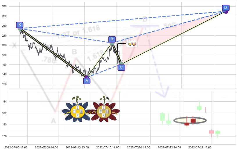 ➢ 谐波蝴蝶:b下跌接近c:猜想支撑性拉升 → 上涨 →【拐点】支撑临近 → 大趋势均值回复