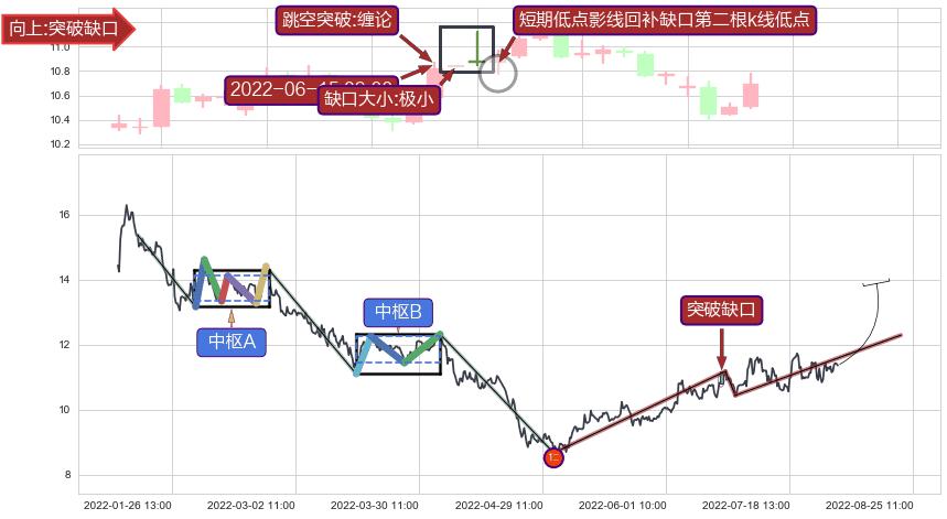 ➣ 突破缺口形成后,后续k已经超过14根,跳空突破缠论突破买卖点3关键点后, 出现【轻微回踩】迹象,短期低点影线回补缺口第二根k线低点
