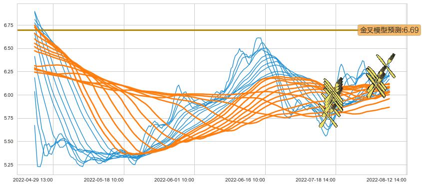 ➣ 110小时均线于(08-05 14:00: 6.10)形成【金叉】基于【金叉历史模型】预测金叉后最高波峰价格: 7.13, 金叉后最高价格6.43,尚未达到预测最高波峰价格, 预期继续上涨