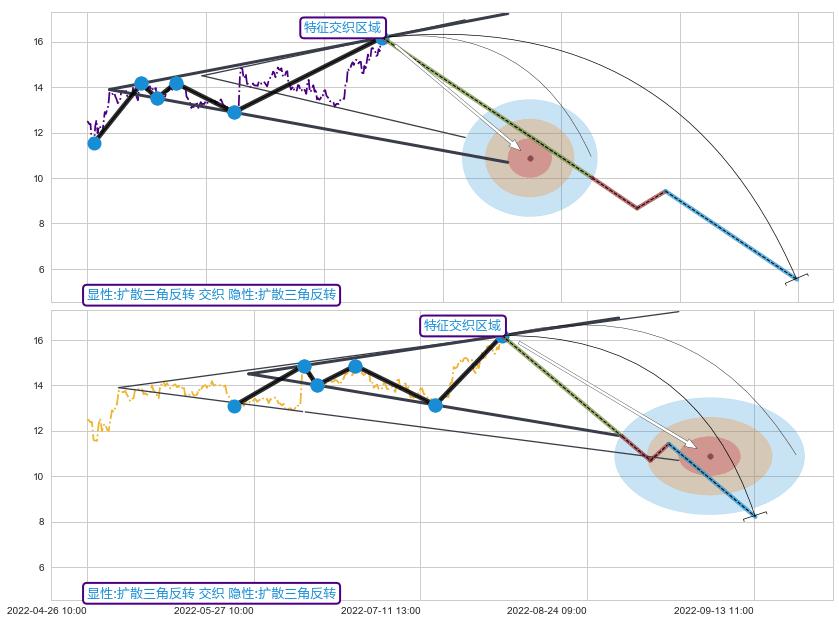 ➣ 扩散三角反转:猜想临近关键支撑位突破点 → 临近拐点下跌 → 风险信号 → 大趋势均值回复