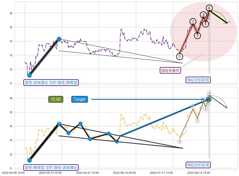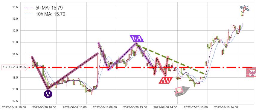 2022-06-14: 第一支撑位13.93有效抑制了下跌浪,成功阻止了价格的继续下跌。