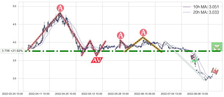 2022-05-19: 第一阻力位3.758有效抑制了下跌浪,成功阻止了价格的继续下跌。