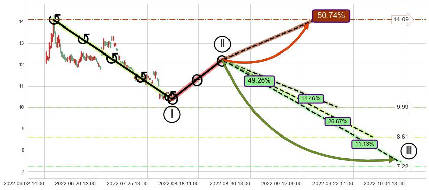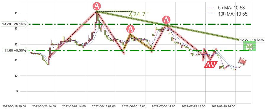 ♘ 阻力价格位13.28,可信任强度74.10%,距离最后交易2022-08-12 14:00形成的收盘价格10.61相差 +25.14%