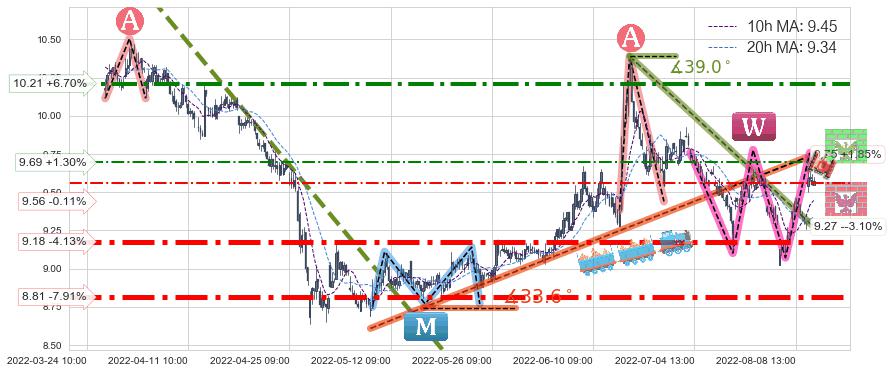 ♘ 阻力价格位9.69,可信任强度44.63%,距离最后交易2022-08-12 14:00形成的收盘价格9.57相差 +1.30%