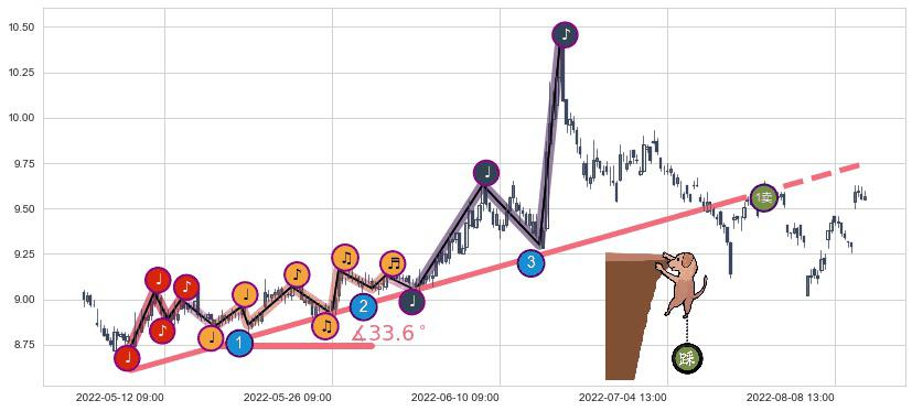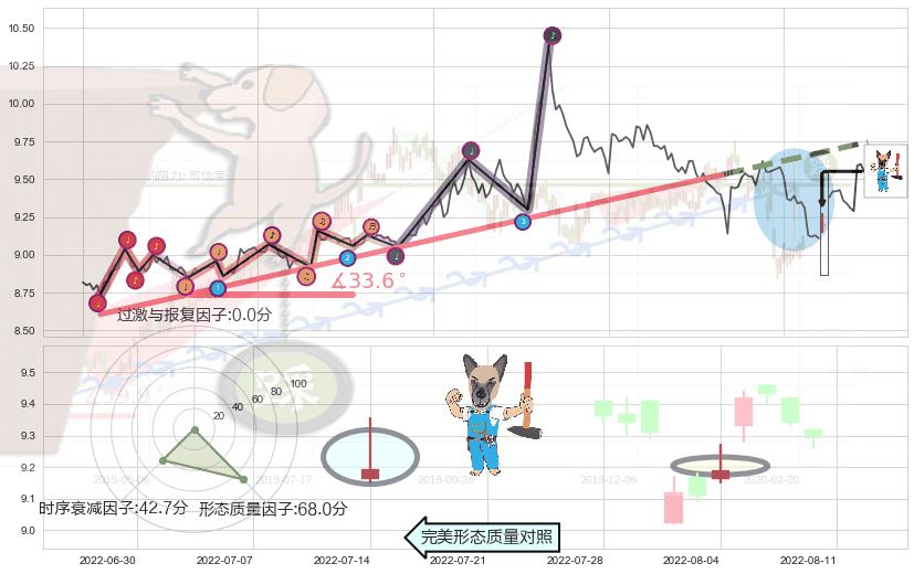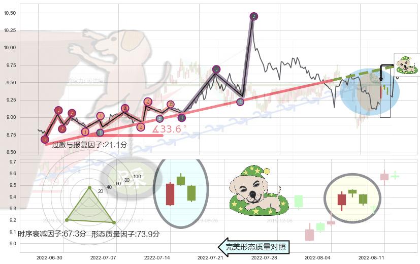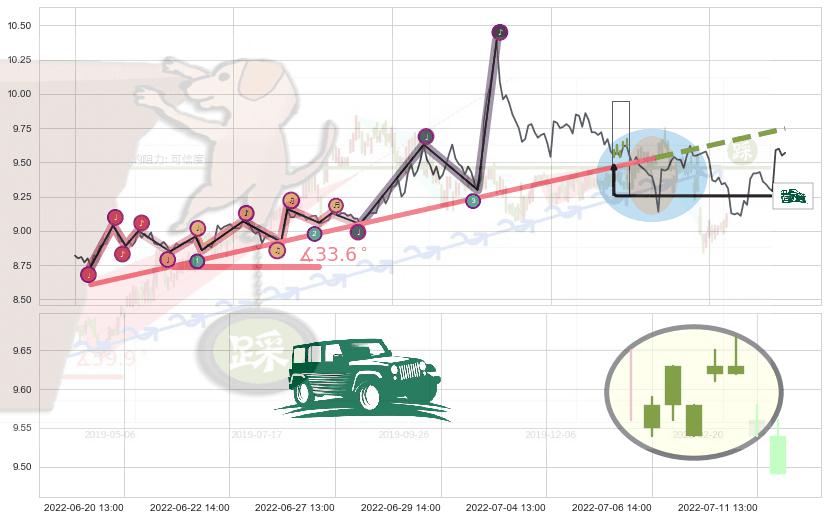 ➣ 2022-05-10 09:00-2022-07-15 13:00上升趋势存在反转[风险],其原上升趋势的支撑位(9.75)已破位[强阻力信号],原上升趋势角度: 33.6˚