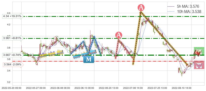 ♘ 阻力价格位3.667,可信任强度81.29%,距离最后交易2022-08-12 14:00形成的收盘价格3.640相差 +0.74%