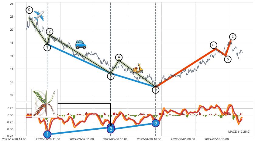 ➣ 波浪理论:猜想达到c点后小反弹终止反转下跌 → 下跌 → 【拐点】临近 → 阶段均值回复结束后继续大周期趋势跟踪