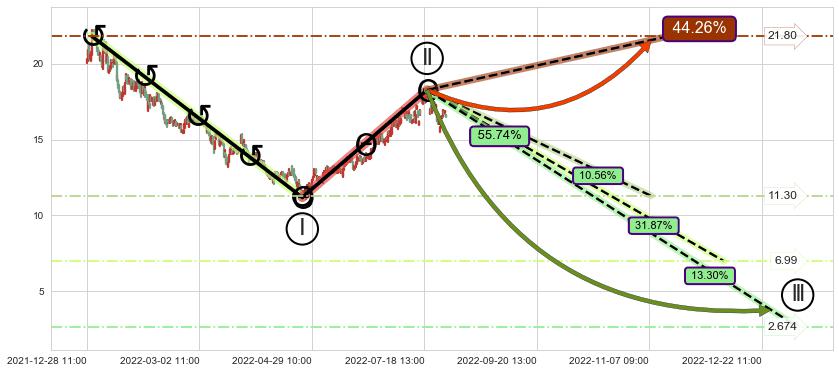 ➣ 调整浪已超过预测的c点位置,后续大趋势循环浪继续下跌概率55.74%,谨慎做多