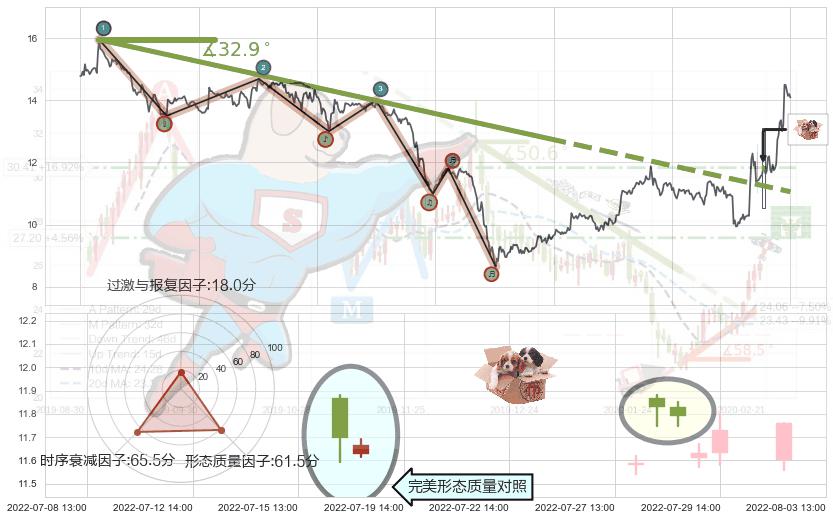 ➢ 🕰 价格走势在2022-08-01 13:00:00至2022-08-01 14:00:00期间形成顶部尽头线(下山虎),残存影响值:-3.74