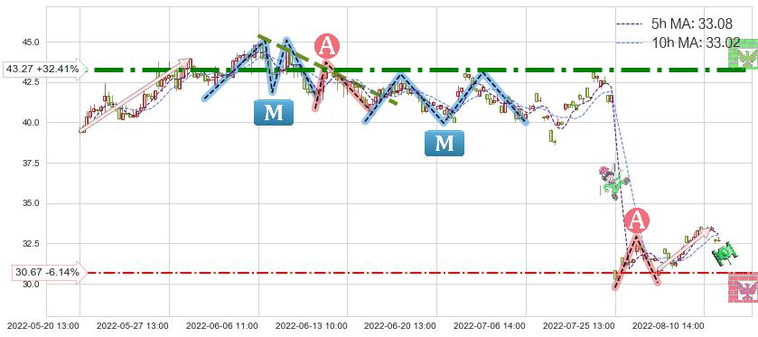 ♘ 支撑价格位30.67,可信任强度54.45%,距离最后交易2022-08-12 14:00形成的收盘价格32.68相差 -6.14%