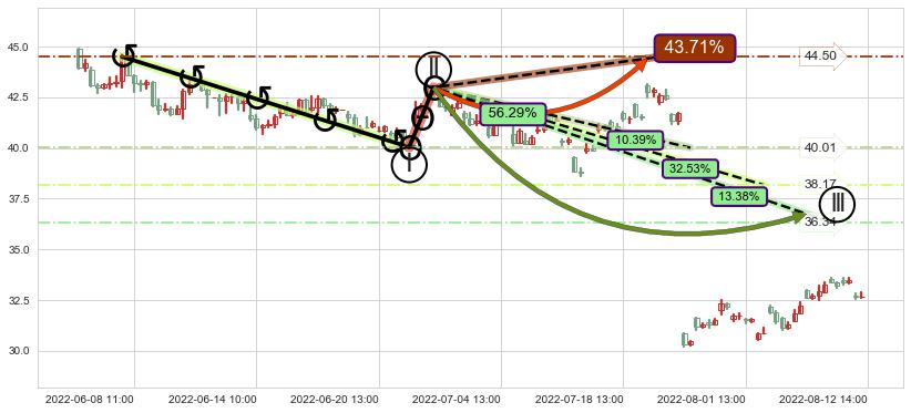 ➢ 循环浪继续向下【最低】位置(08-10:13, 36.34),匹配聚类样本比例23.76%, 可能性概率13.38%