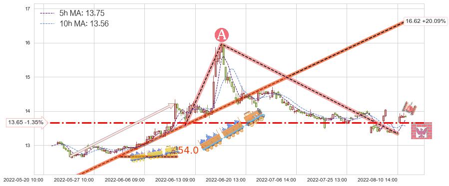 2022-06-10: 第一支撑位13.65起到了持续的支撑作用,有效地促进了价格的回升。