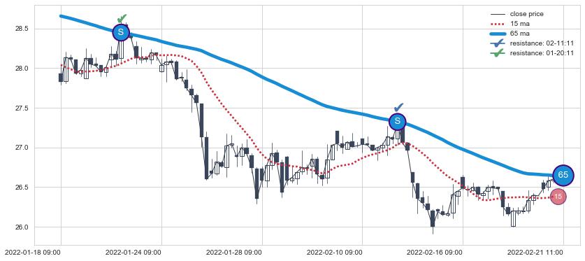 01-13 14:00至02-21 11:00 慢线与快线呈空头排列, 慢线与快线接触少,无缠绕