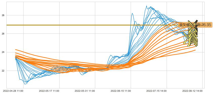 ➢ 70小时均线于(08-10 14:00: 26.78)形成【金叉】基于【金叉历史模型】预测金叉后最高波峰价格: 28.63, 金叉后最高价格27.45,尚未达到预测最高波峰价格, 预期继续上涨