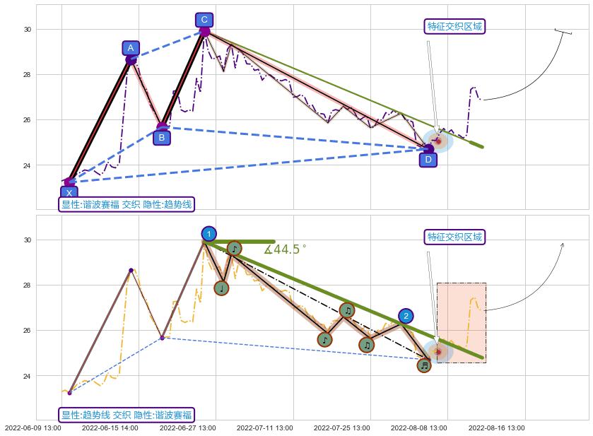 ➢ 2022-06-23 13:00-2022-08-11 13:00下跌趋势存在反转上涨[机会],其原下跌趋势的阻力位(24.78)已被突破[强支撑信号],原下跌趋势角度: 44.5˚