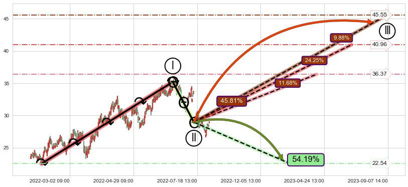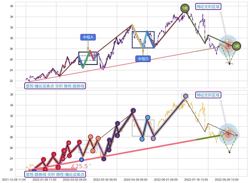 从2021-12-30 13:00至2022-06-22 13:00,共包含554个小时,阶段股价上涨38.47%,阶段股价变动位移路程比: 1 : 12,上涨趋势角度: 25.5