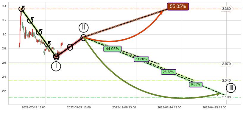 ➢ 循环浪继续向下【最低】位置(05-01:14, 2.108),匹配聚类样本比例21.43%, 可能性概率9.63%
