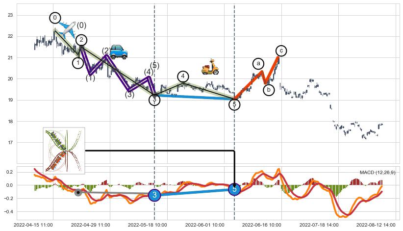 ➣ 第一, 三, 五浪下跌动能逐渐【衰弱变小】,趋势呈现不稳迹象