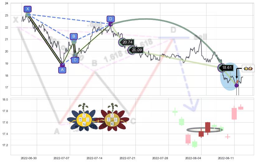 ➣ 谐波蝙蝠:d下跌已到达第❸目标:猜想支撑拉升 → 上涨 →【拐点】机会信号 → 大趋势均值回复