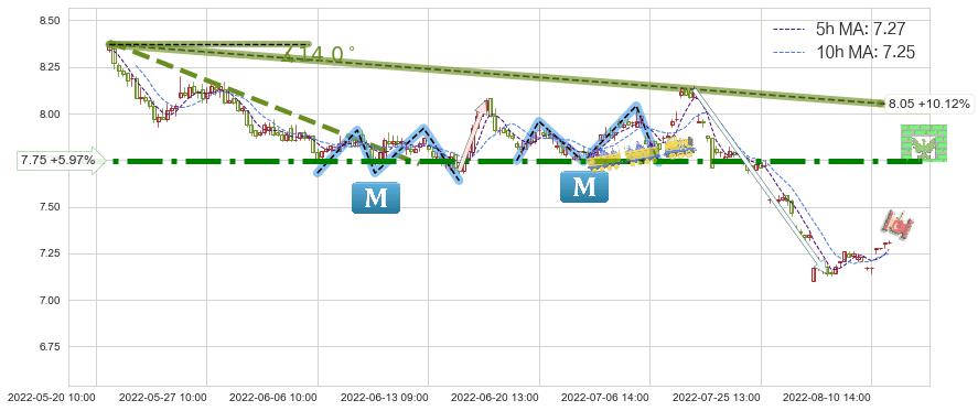 ♘ 阻力价格位7.75,可信任强度88.96%,距离最后交易2022-08-12 14:00形成的收盘价格7.31相差 +5.97%