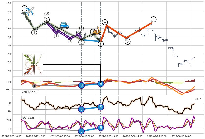 2022-06-14: 时域附近第一阻力位7.75持续的对下跌趋势进行阻拦,有效地放缓了下跌的速度。