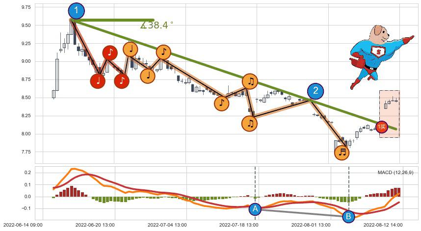 从2022-06-15 13:00至2022-08-12 13:00,共包含91个小时,阶段股价下跌-11.82%,阶段股价变动位移路程比: 1 : 5,下跌趋势角度: 38.4