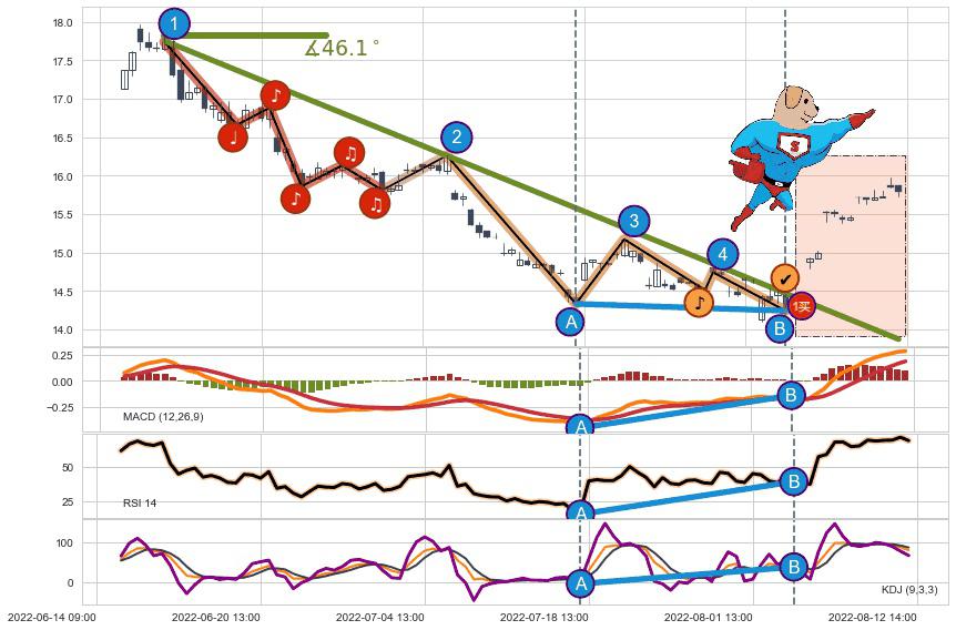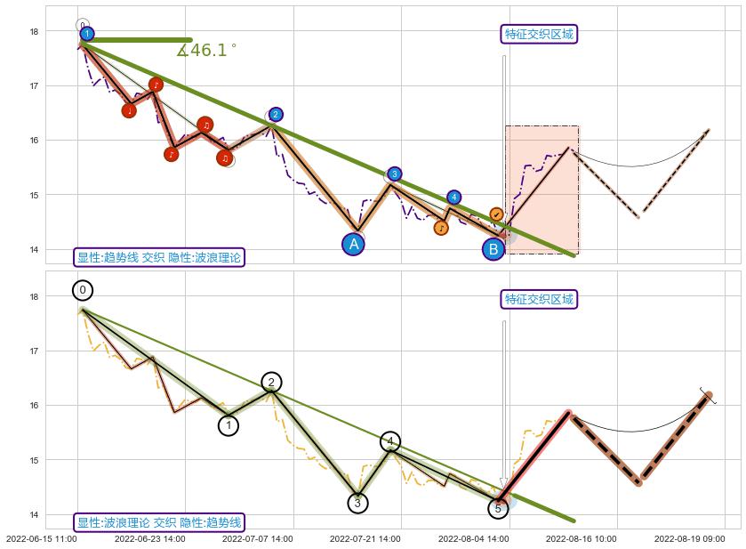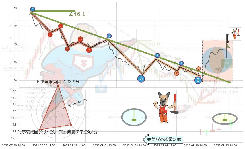 从2022-06-15 13:00至2022-08-05 13:00,共包含81个小时,阶段股价下跌-16.66%,阶段股价变动位移路程比: 1 : 4,下跌趋势角度: 46.1
