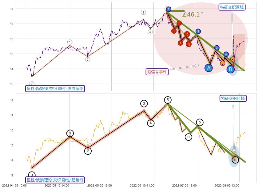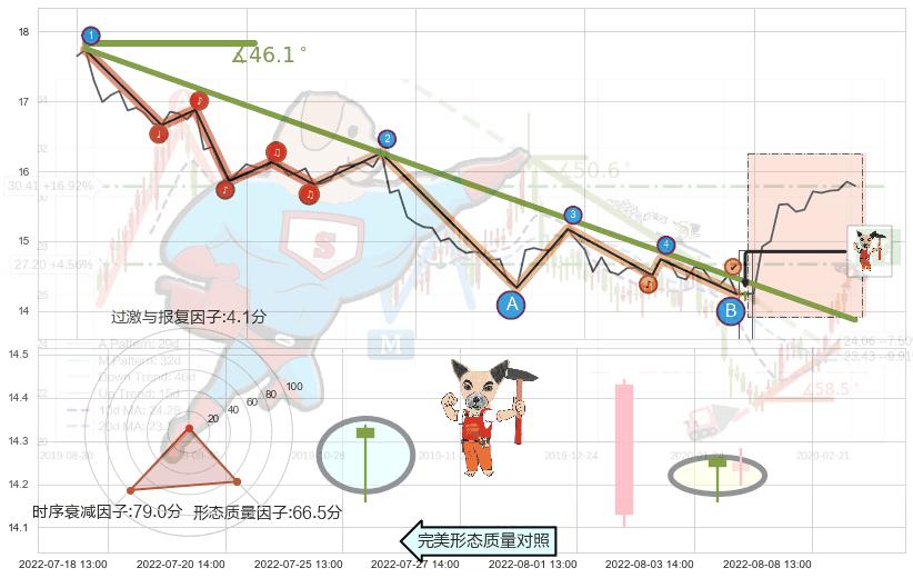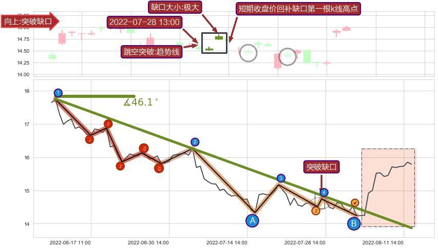 ➢ 2022-06-15 13:00-2022-08-05 13:00下跌趋势存在反转上涨[机会],其原下跌趋势的阻力位(13.87)已被突破[强支撑信号],原下跌趋势角度: 46.1˚