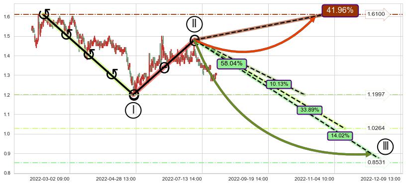 ➣ D点拟合预测价格1.5787,距离最后交易收盘价格1.3000相差 +21.44%