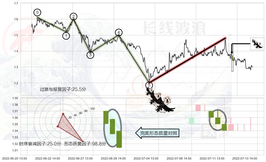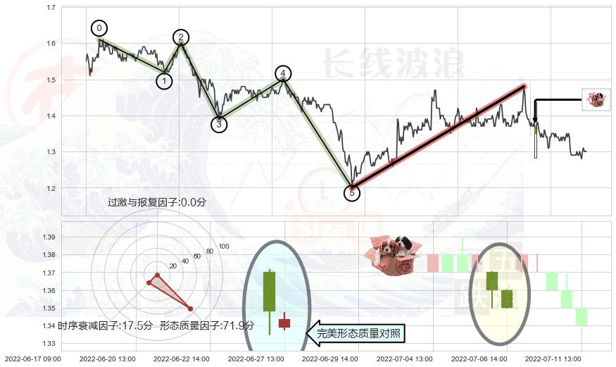 ➢ 🕰 价格走势在2022-07-06 13:00:00至2022-07-06 14:00:00期间形成底部尽头线(上山虎),残存影响值:1.56