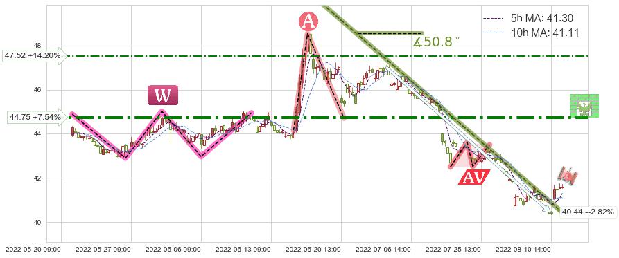 ♘ 阻力价格位44.75,可信任强度77.43%,距离最后交易2022-08-12 14:00形成的收盘价格41.61相差 +7.54%
