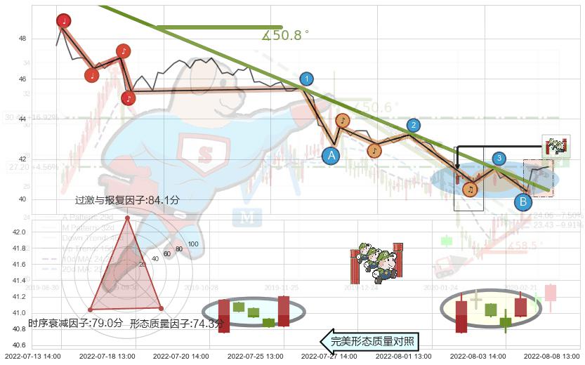 ➢ 2022-06-15 13:00-2022-08-12 13:00下跌趋势存在反转上涨[机会],其原下跌趋势的阻力位(40.44)已被突破[强支撑信号],原下跌趋势角度: 50.8˚