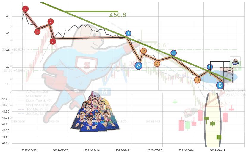 ➣ 2022-06-15 13:00-2022-08-12 13:00下跌趋势存在反转上涨[机会],其原下跌趋势的阻力位(40.44)已被突破[强支撑信号],原下跌趋势角度: 50.8˚