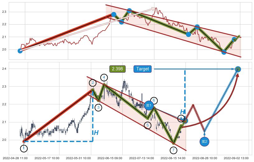 ➢ 升旗形:下跌目标target已达成:猜想强支撑位临近,预期反弹上涨(均值回复)