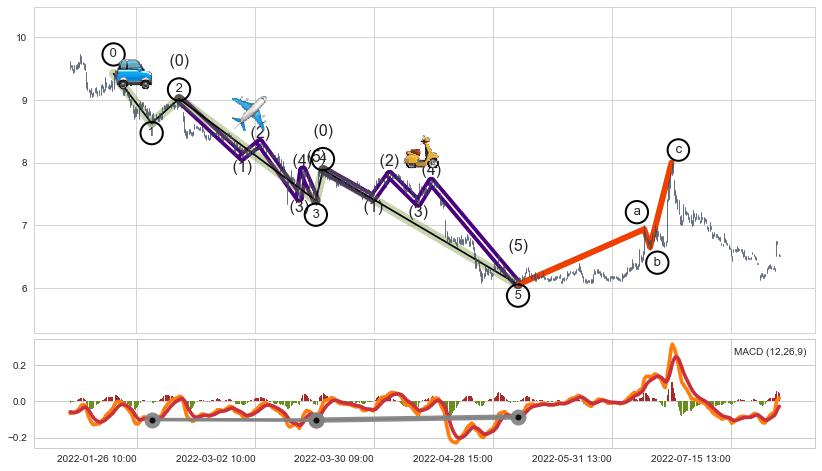 ➢ 波浪理论:猜想达到c点后小反弹终止反转下跌 → 下跌 → 【拐点】临近 → 阶段均值回复结束后继续大周期趋势跟踪