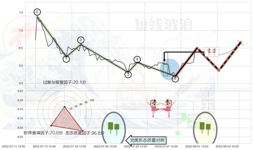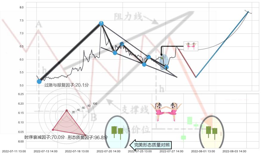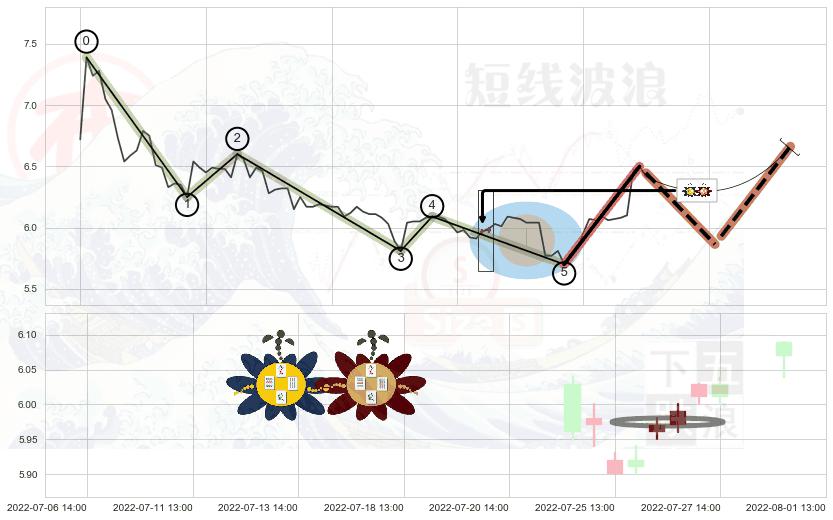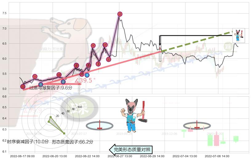➣ 2022-05-24 14:00-2022-07-04 14:00上升趋势存在反转[风险],其原上升趋势的支撑位(6.94)已破位[强阻力信号],原上升趋势角度: 39.5˚