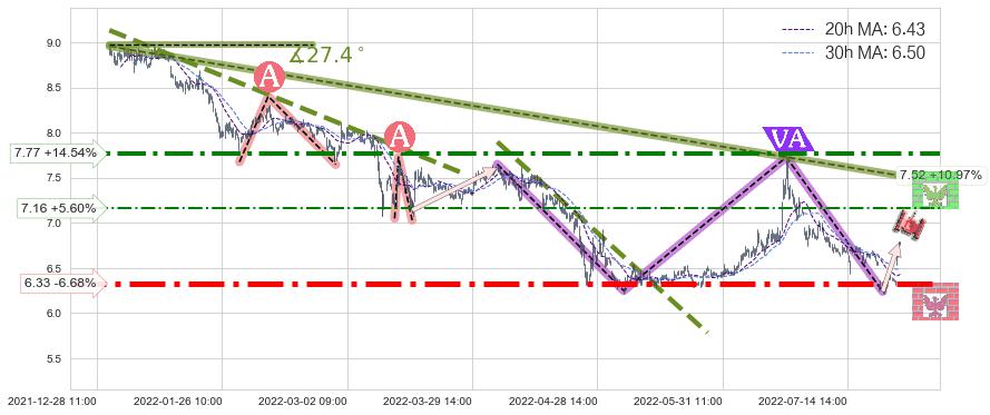 ♘ 在最后的下跌阶段2021-12-30 11:00至2022-08-11 14:00,存在 持续未破位的阻力位 ,阻力价格7.52,可信任强度88.16%,其距离最后价格6.78相差 +10.97%