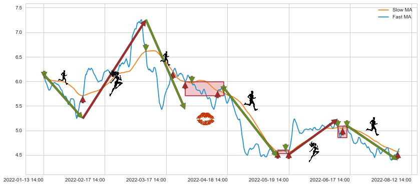 05-16 10:00至05-19 14:00 慢线与快线多次接触,存在上下穿越,有缠绕