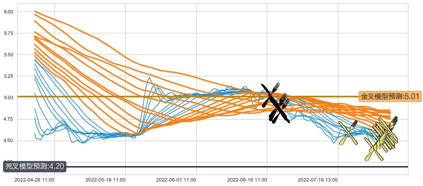 ➣ 233小时均线于(06-16 14:00: 5.02)形成【死叉】基于【死叉历史模型】预测死叉后最低波谷价格: 4.32, 死叉后最低价格4.37,尚未达到预测最低波谷价格, 预期继续下跌