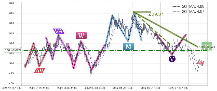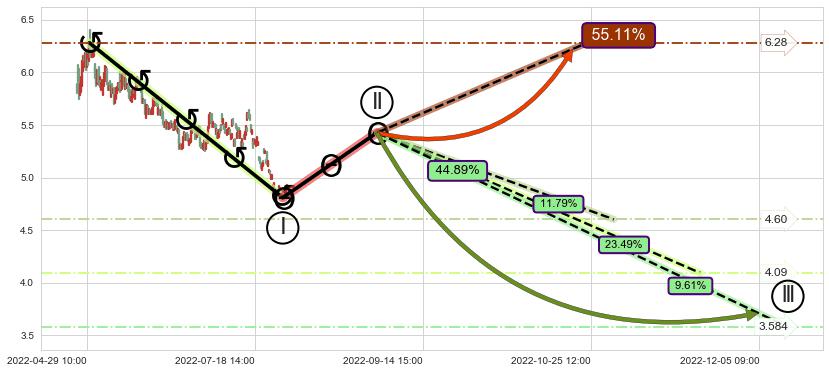2022-06-06: 第一阻力位5.32有效抑制了下跌浪,成功阻止了价格的继续下跌。