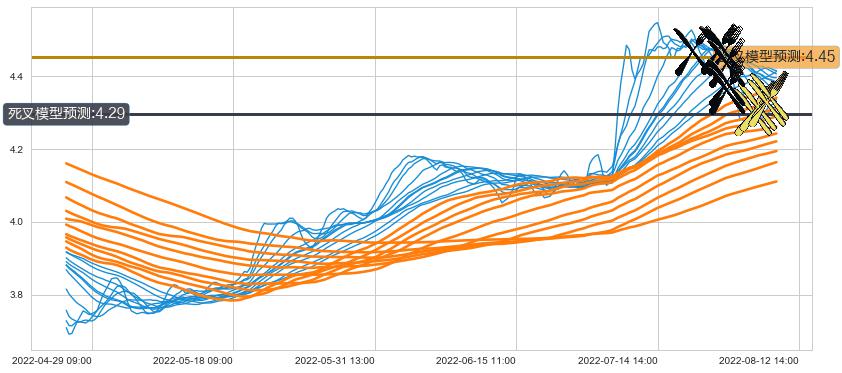 ➢ 45小时均线于(08-01 14:00: 4.43)形成【死叉】基于【死叉历史模型】预测死叉后最低波谷价格: 4.33, 死叉后最低价格4.24,已经下跌超出预测最低波谷价格, 预期反弹