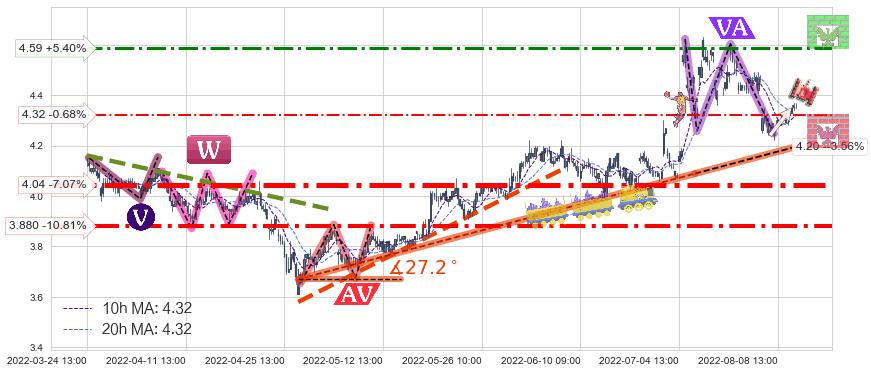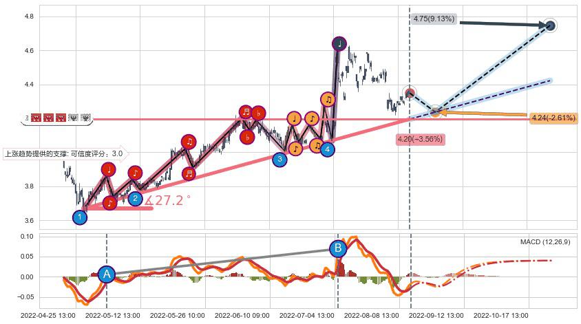 ♘ 阻力价格位4.59,可信任强度55.50%,距离最后交易2022-08-12 14:00形成的收盘价格4.35相差 +5.40%