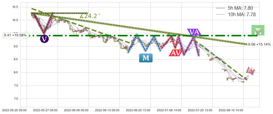 ♘ 阻力价格位9.41,可信任强度97.23%,距离最后交易2022-08-12 14:00形成的收盘价格7.87相差 +19.58%