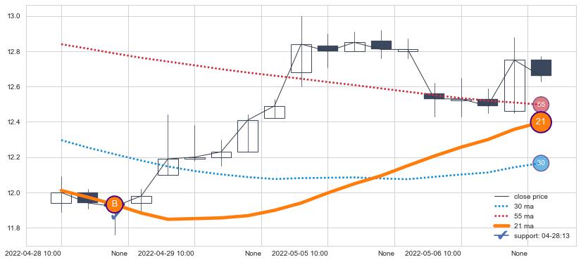 ➣ 21小时均线于(08-10 13:00: 13.17)形成【金叉】基于【金叉历史模型】预测金叉后最高波峰价格: 13.70, 金叉后最高价格13.77,虽然已经到达预测最高波峰价格,但耗时间很短动能很强, 预期继续上涨