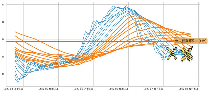 ➢ 40小时均线于(08-08 14:00: 13.11)形成【金叉】基于【金叉历史模型】预测金叉后最高波峰价格: 13.98, 金叉后最高价格13.77,尚未达到预测最高波峰价格, 预期继续上涨