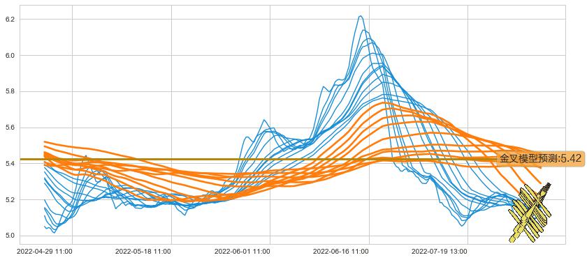 ➢ 70小时均线于(08-11 14:00: 5.19)形成【金叉】基于【金叉历史模型】预测金叉后最高波峰价格: 5.50, 金叉后最高价格5.24,尚未达到预测最高波峰价格, 预期继续上涨